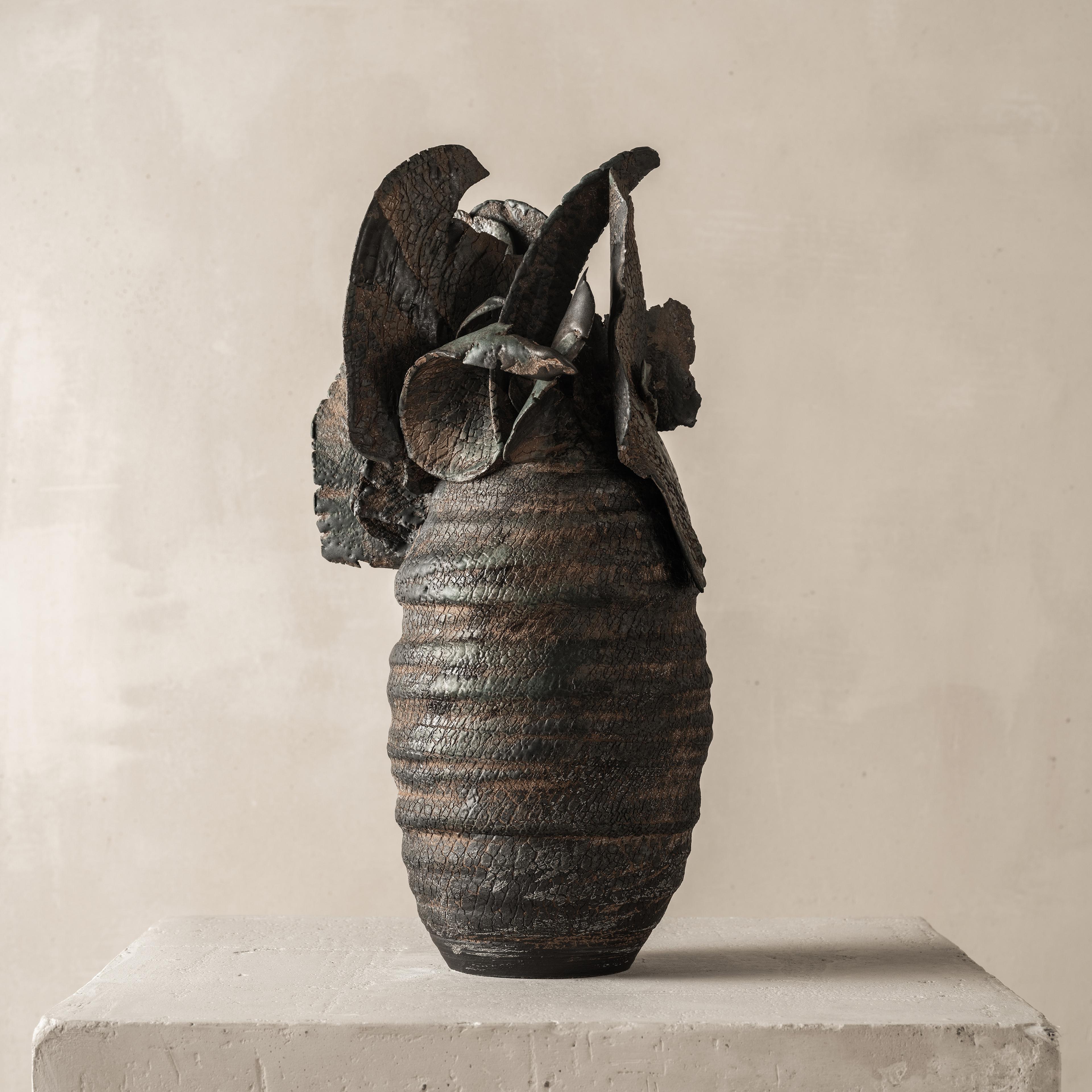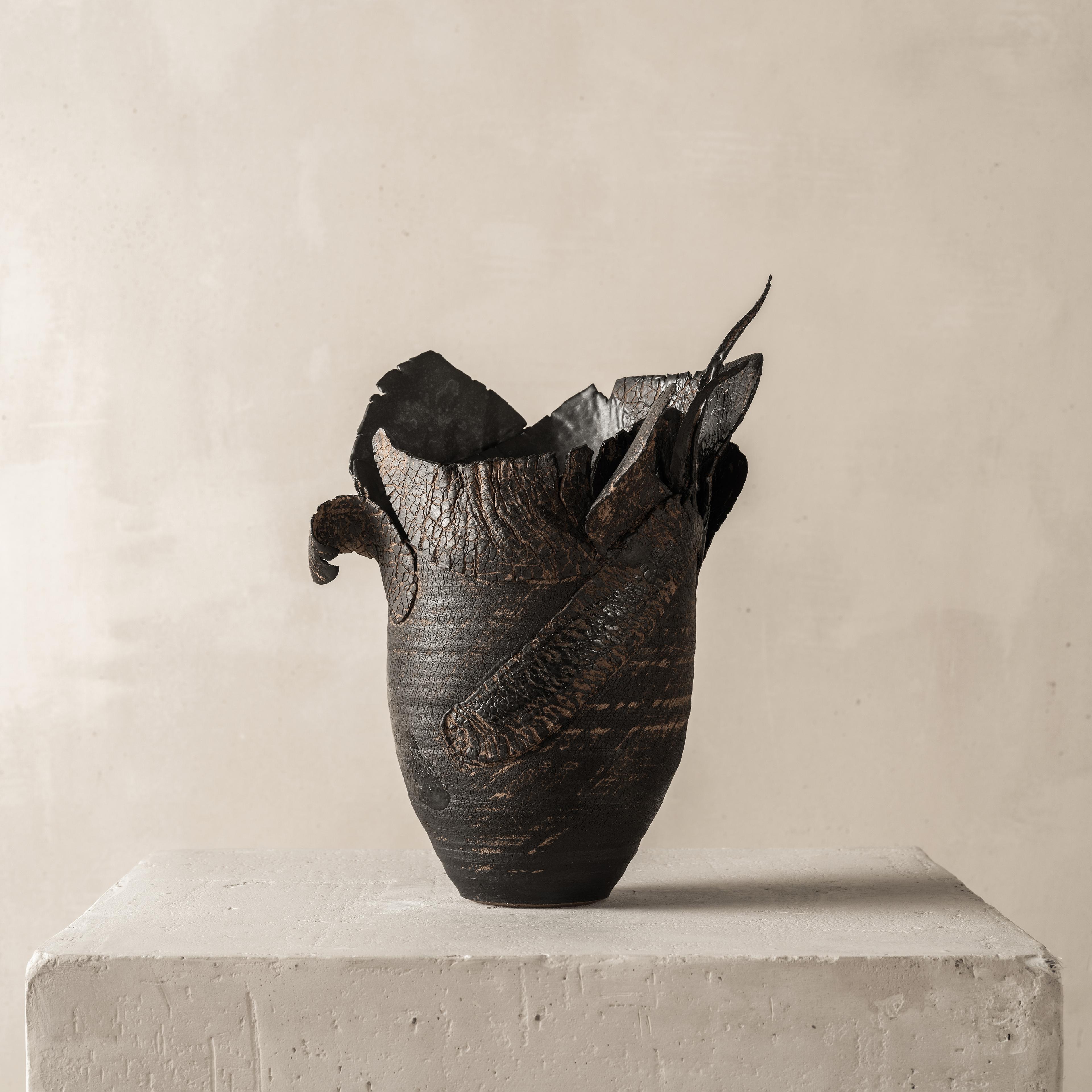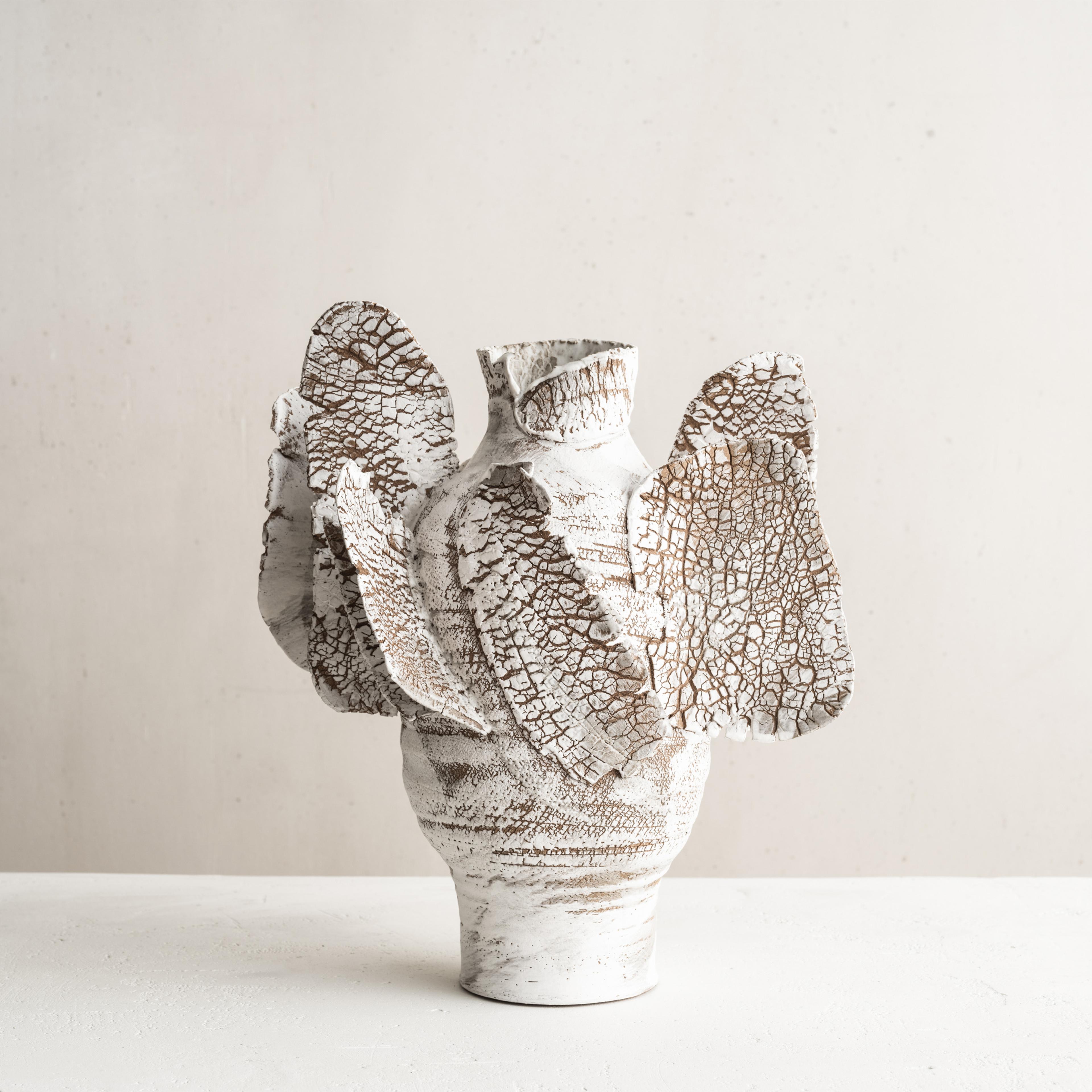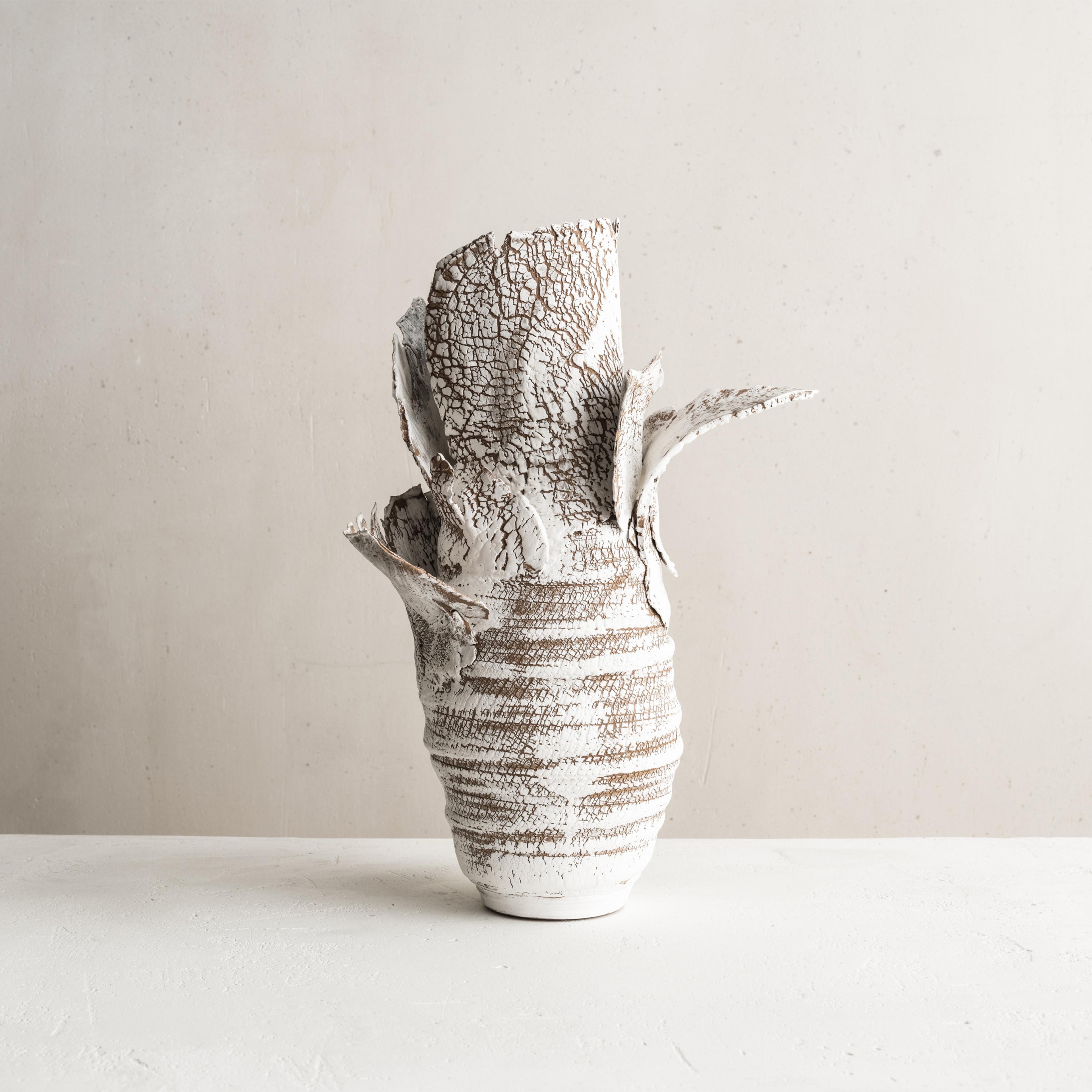 The sculptural quality of the vessels transcends function bringing an ardor to the centuries-old practice of hand-forming clay. Evoking a visual language of Greek mythology, the hand-formed appendages are materialized from thin slabs to create organic, sprawling shapes adhered to the outer wall of the hand-thrown vessels. The layered surfaces composed of brush-applied slips and glazes are fired to create eroded, cracked surfaces. The serpentine likeness, in both the tactility of the skins and form of the works, nod to the symbolism of serpents. As archetypes of renewal and healing, they embody the process of transformation particularly poignant in the prevailing moment.