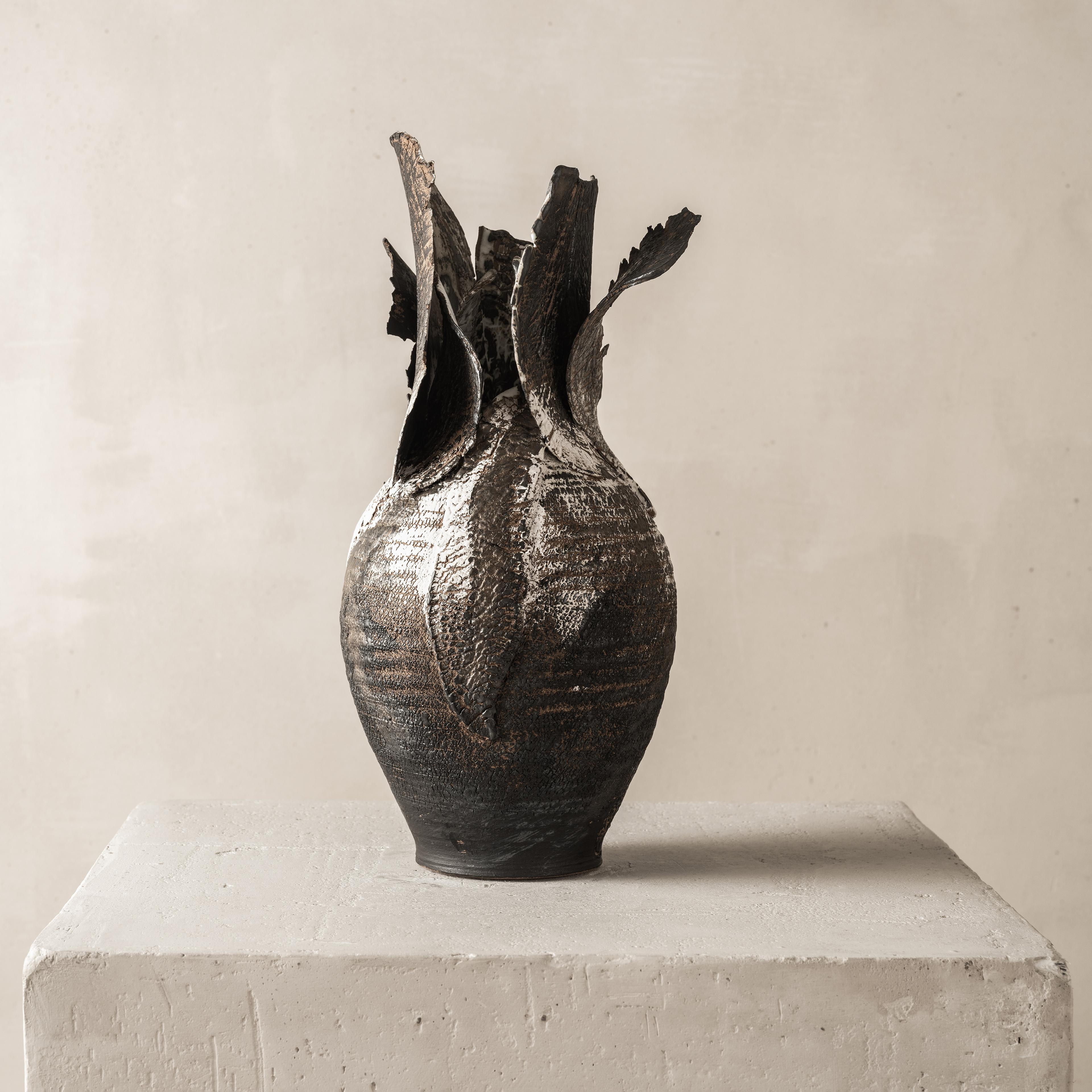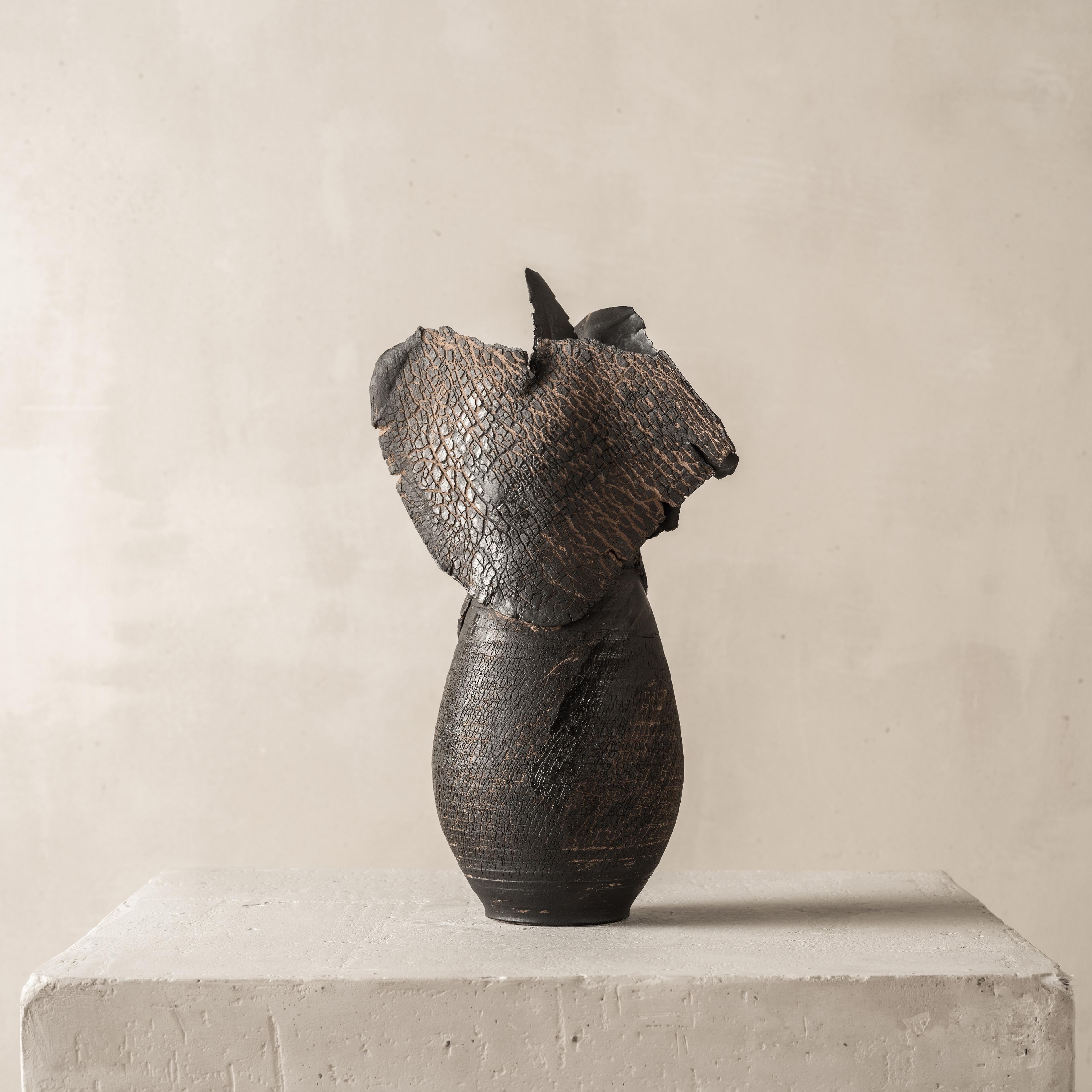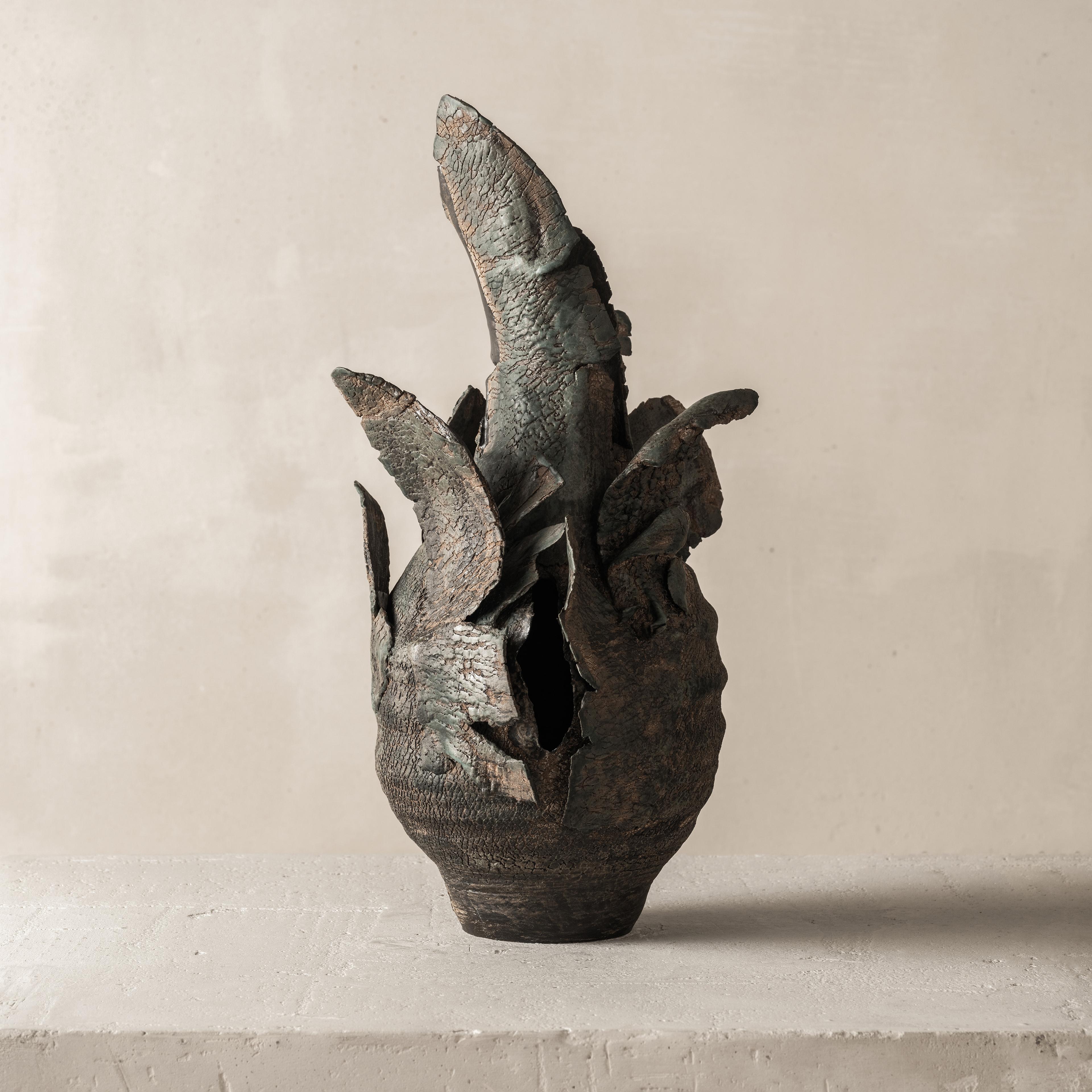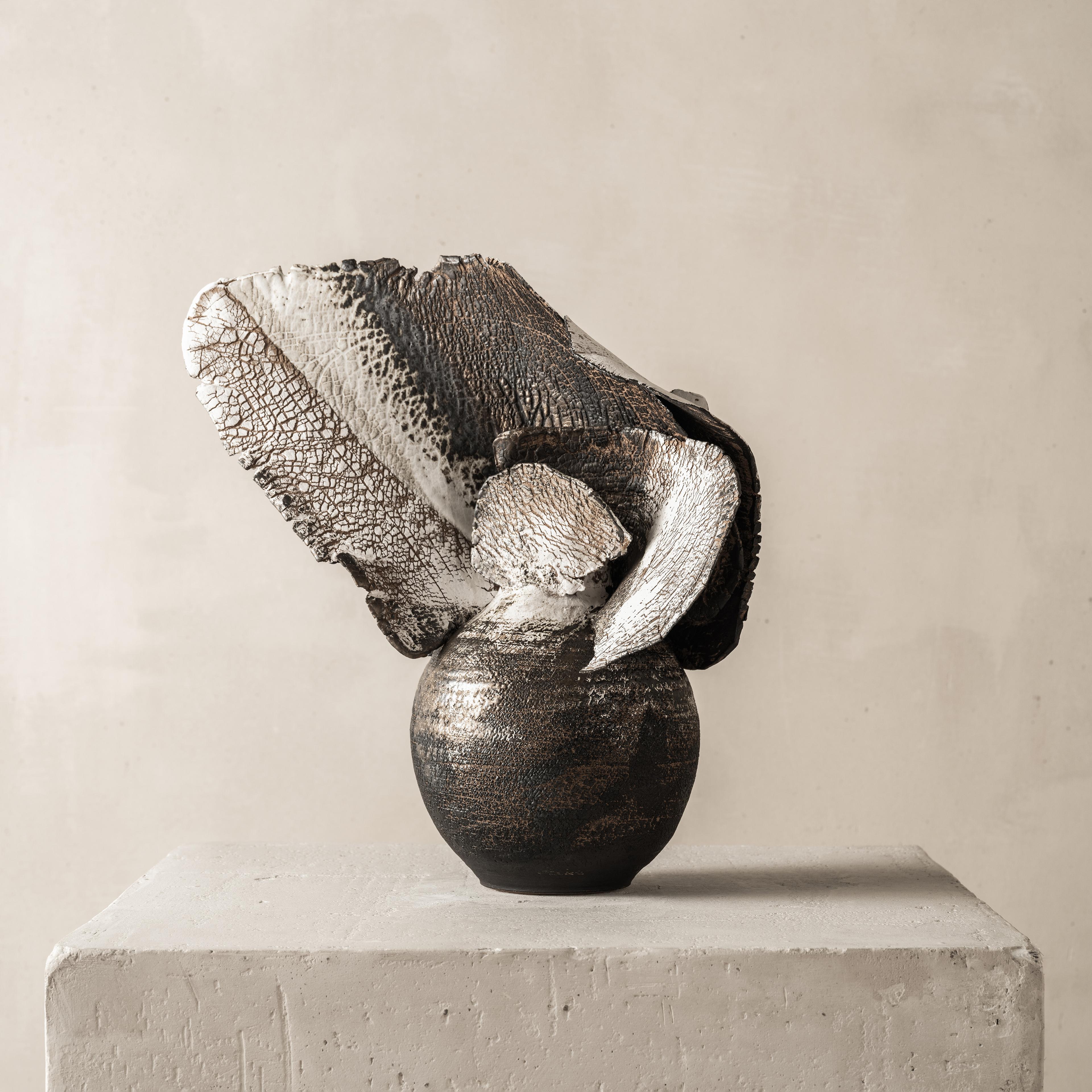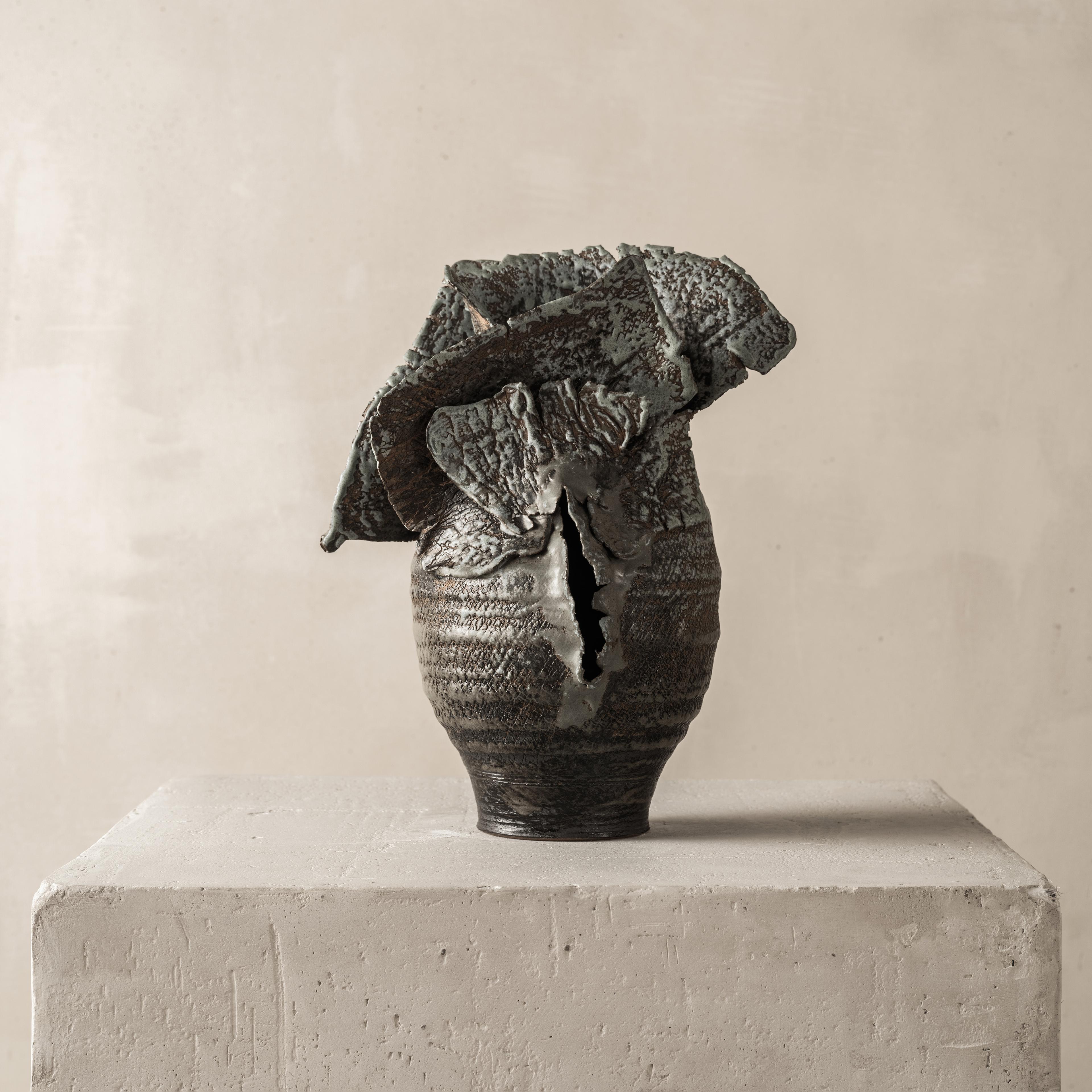 The sculptural quality of the vessels transcends function bringing an ardor to the centuries-old practice of hand-forming clay. Evoking a visual language of Greek mythology, the hand-formed appendages are materialized from thin slabs to create organic, sprawling shapes adhered to the outer wall of the hand-thrown vessels. The layered surfaces composed of brush-applied slips and glazes are fired to create eroded, cracked surfaces. The serpentine likeness, in both the tactility of the skins and form of the works, nod to the symbolism of serpents. As archetypes of renewal and healing, they embody the process of transformation particularly poignant in the prevailing moment.