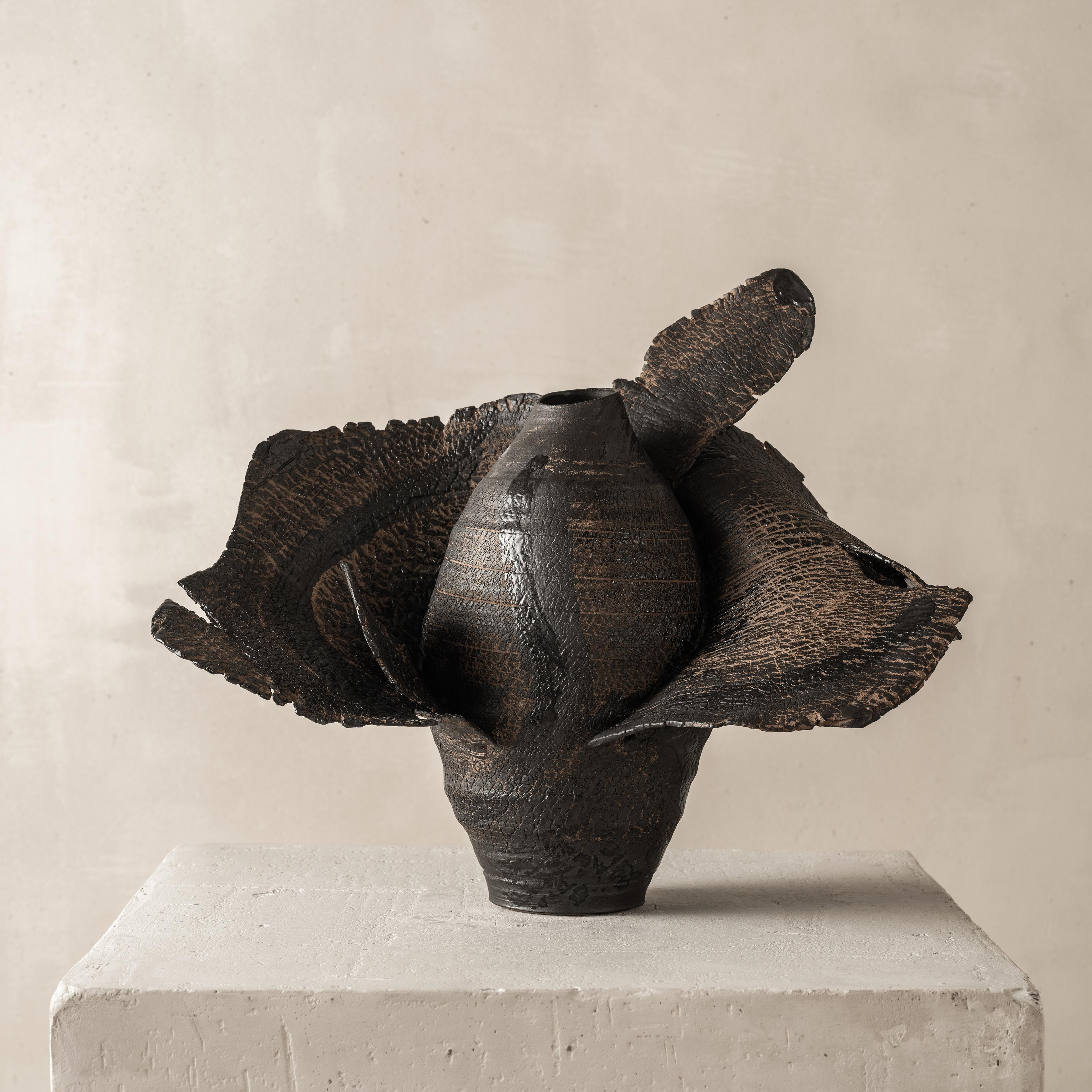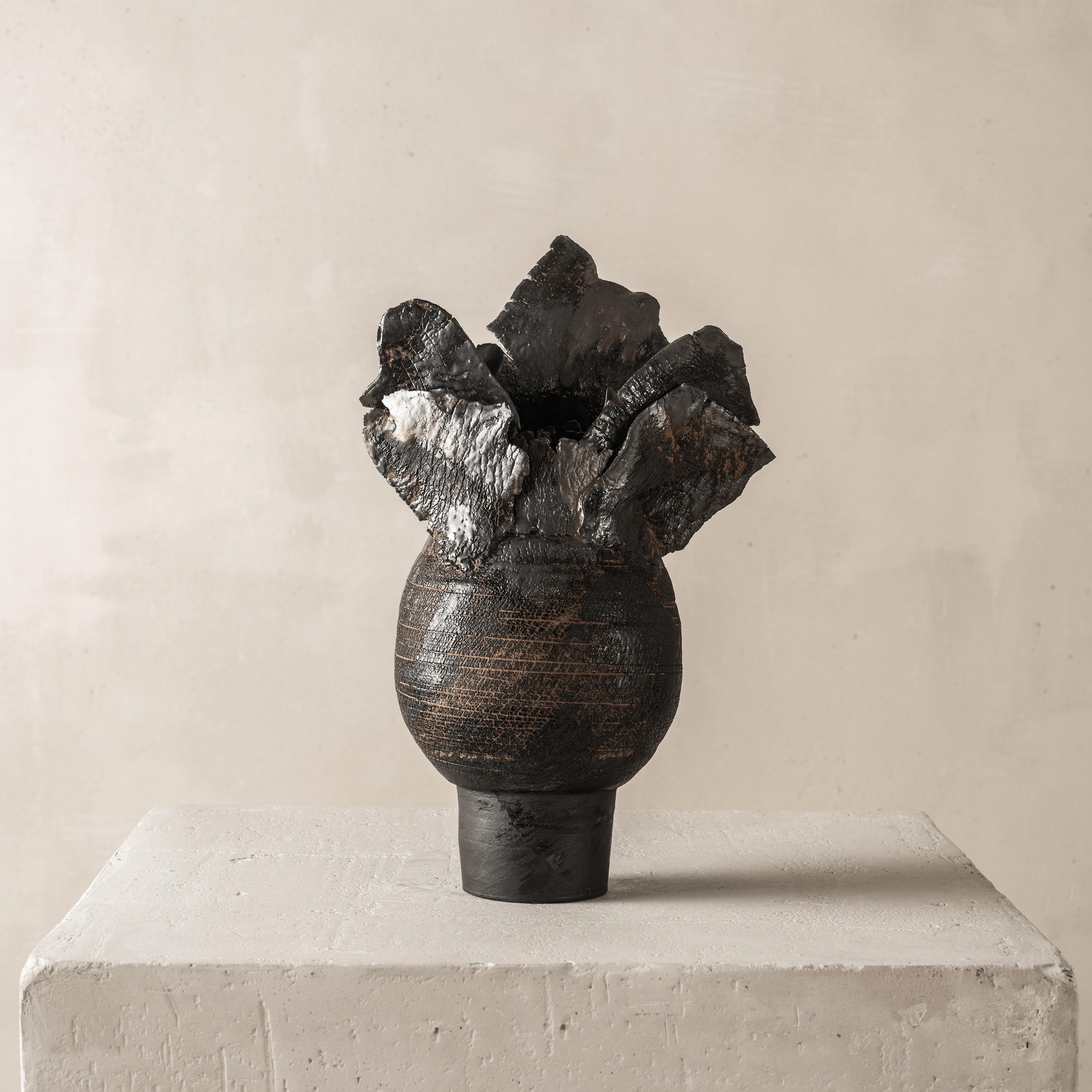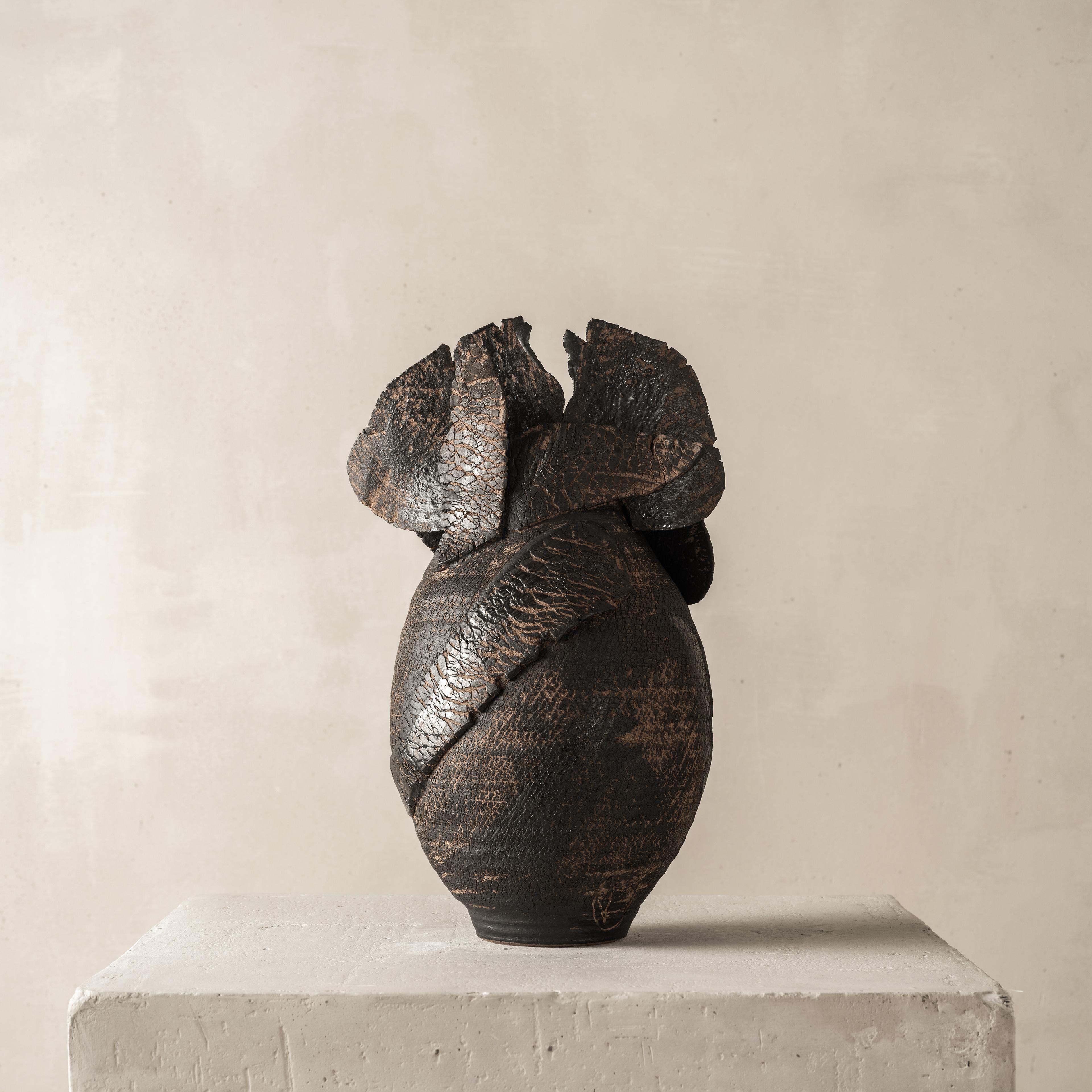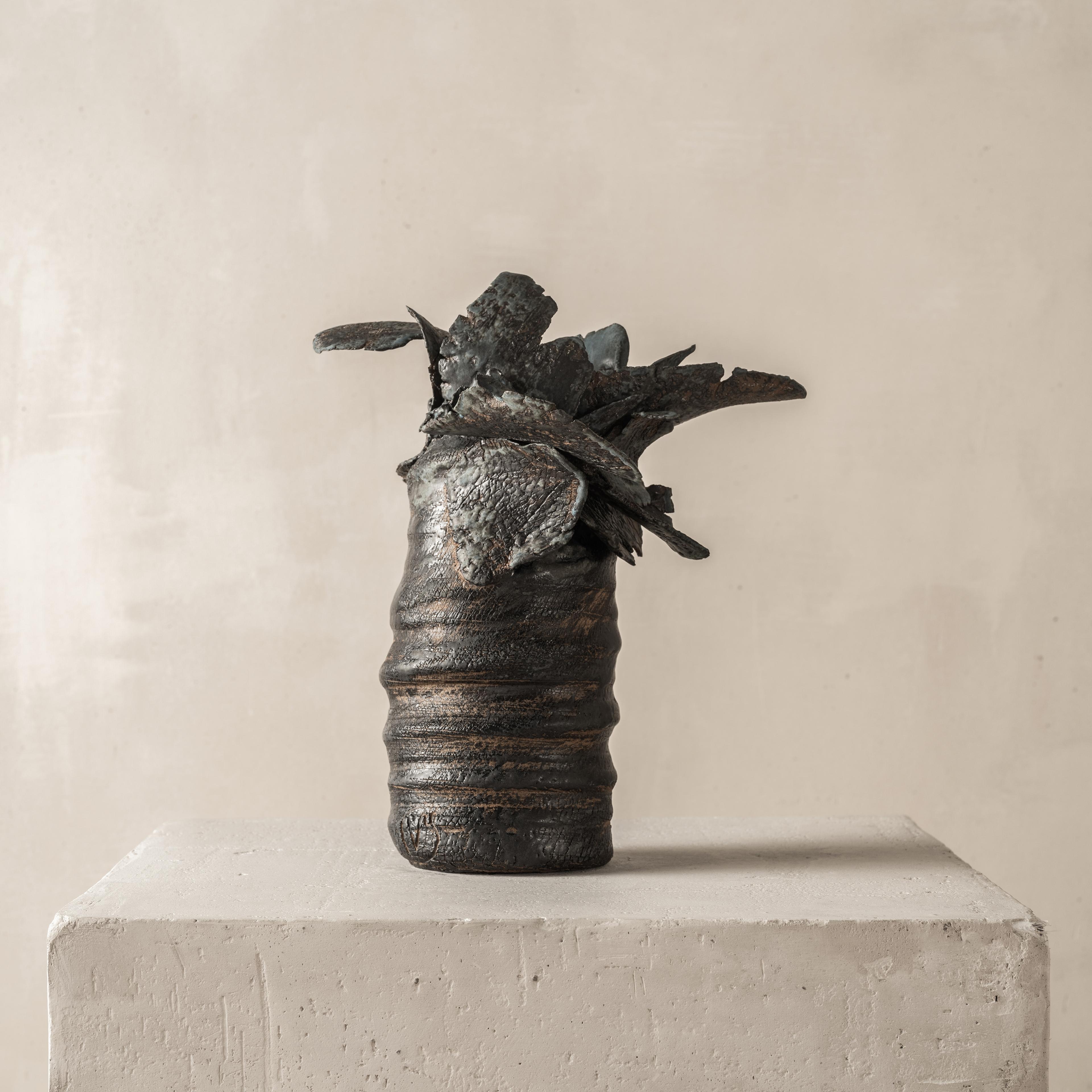 The sculptural quality of the vessels transcends function bringing an ardor to the centuries-old practice of hand-forming clay. Evoking a visual language of Greek mythology, the hand-formed appendages are materialized from thin slabs to create organic, sprawling shapes adhered to the outer wall of the hand-thrown vessels. The layered surfaces composed of brush-applied slips and glazes are fired to create eroded, cracked surfaces. The serpentine likeness, in both the tactility of the skins and form of the works, nod to the symbolism of serpents. As archetypes of renewal and healing, they embody the process of transformation particularly poignant in the prevailing moment.