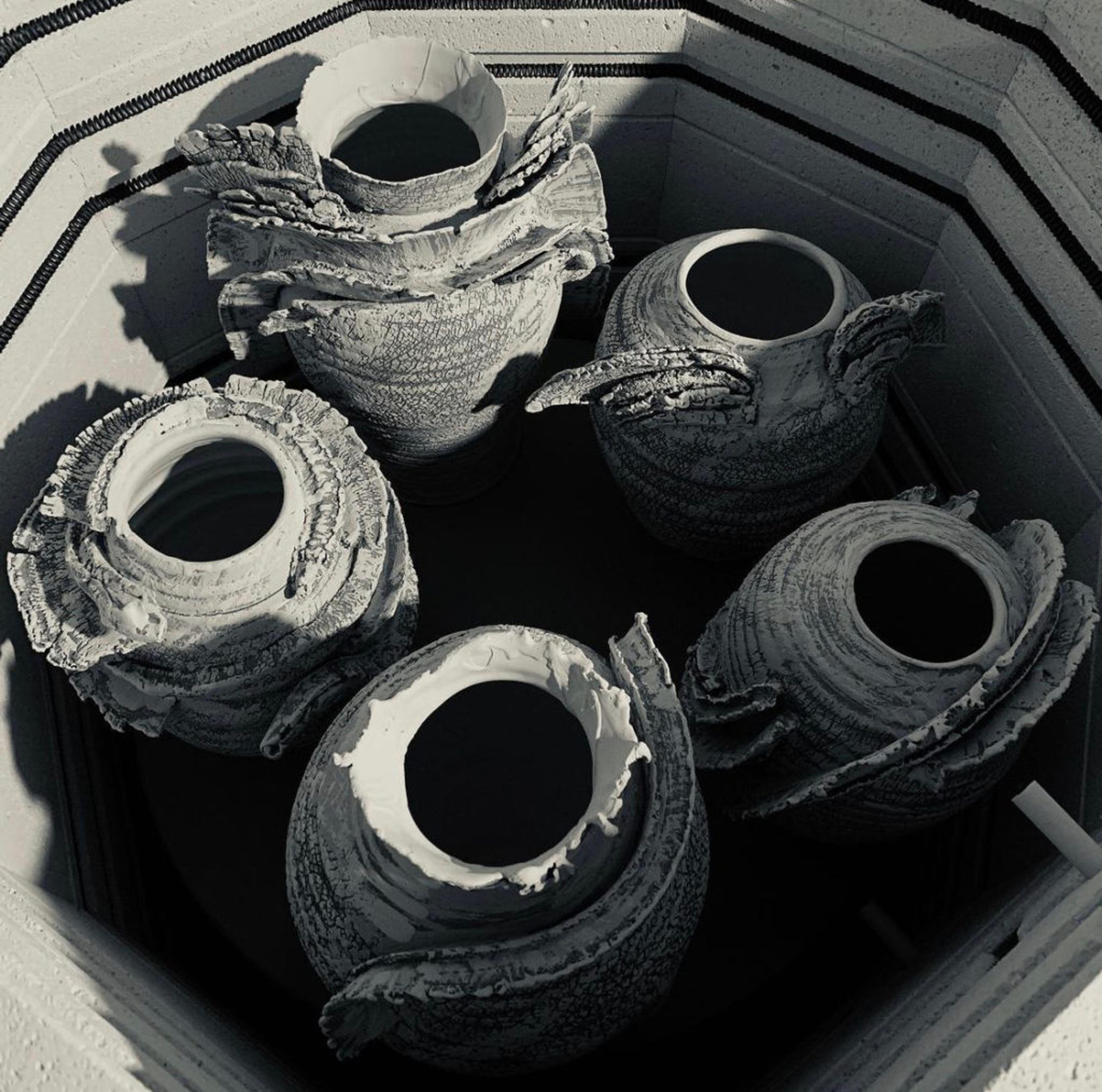 CHTHONIC follows the multidisciplinary artist's first ceramic show with Les Ateliers Courbet, Archaeos, in the Fall of 2019. Archaeos offered a contemporary interpretation of the traditional wheel-thrown forms of Antiquity ceramics with a focus on emphasized textures. Speliopoulos further explores his Greek heritage and integrates his experience as a fashion designer with the new series of vessels. He likens clay to felt, organza, and muslin to be formed and sculpted upon a form. As he expresses, “I instinctively create each vessel as a sculpture, as a three-dimensional form, a fantastical personality, like a dress with drape, movement, detail. Some are pure and austere, others are layered, rich with detail, each seeking a balance.”