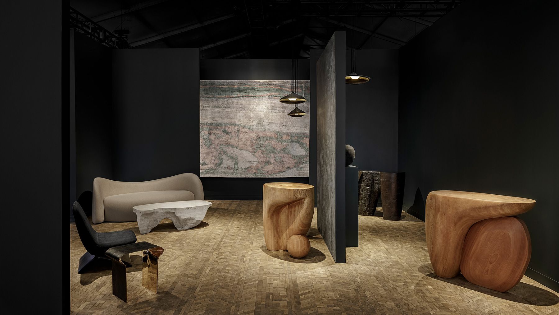 The booth sets Navot’s design language in dialogue with other artists and artisans represented by the gallery. The presentation includes a selection of works from Mauro Mori’s solo exhibition at the gallery, Portraits, of hand-carved Albizia Rosa sculptural tables, the Listener, and Figlio di Audiface, along with the Listener in white limestone. A contemporary of Navots at Design Academy Eindhoven, Pieter Maes’ Palindrome brings together the wood crafting of Rutger Graas and the master upholstery of Jouffre. Smoked stoneware ceramics from French-based Karen Swami brings the artist’s exploration of texture, form, and materiality in her vessels. A Bronze Contour side table from Bodo Sperlein’s latest exhibition with the gallery emphasizes the consistent visual and tactile sensuality in the designer’s vocabulary as the dual bronze finish highlights the movements and folds of the works.