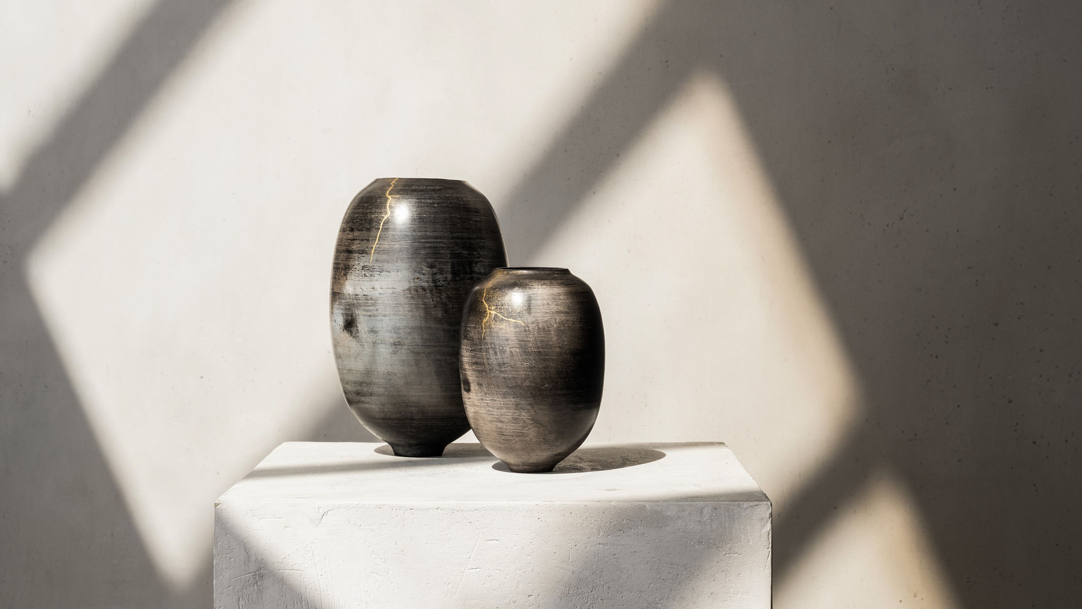 The vessels are glazed in Japanese vegetal lacquer and pure gold. Their classical forms draw inspiration from ancient traditions, ranging from Nagada amphorae to Cretan and Etruscan vases, ancient Egyptian ceramic plates, and Babylonian architecture.